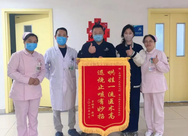 “哄娃一流医术高,退烧止咳有妙招”——近日,一面充满童趣又饱含深情的锦旗,被送到我院儿科医护团队手中。送锦旗的,是一位刚康复出院的脓毒血症患儿的家长。这面锦旗,不仅见证了孩子从病危到痊愈的艰难历程,更承载着一个家庭对医护人员的由衷感激